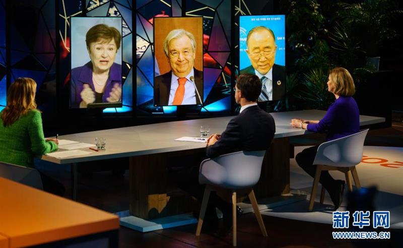 这是1月25日在荷兰海牙拍摄的联合国秘书长古特雷斯(中)等通过视频连线出席首届气候适应峰会。