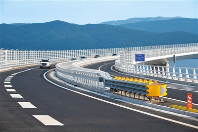 2022年7月27日,克罗地亚科马尔纳,车辆在佩列沙茨大桥上行驶。当日是克罗地亚佩列沙茨大桥正式通车的第一天。