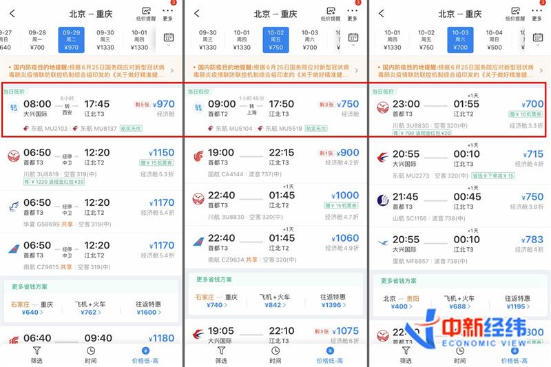 9月30日、10月1日北京到重庆经济舱机票最低价。数据来源:携程旅行APP