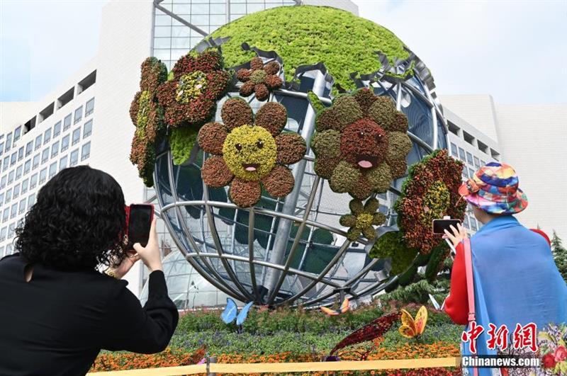 9月26日,市民在北京西单路口西北角《命运共同体》国庆主题花坛前拍照。 中新社记者 张兴龙 摄