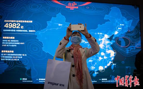11月22日,浙江桐乡乌镇,“互联网之光”博览会上,一位女士举起手机拍摄现场盛况,她身后阿里巴巴、蚂蚁集团展位的大屏幕正在播放今年天猫“双11”成交数据的可视化图表。