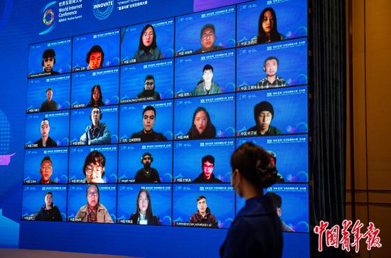 11月24日,浙江桐乡乌镇,“直通乌镇”全球互联网大赛总决赛现场,线上线下同步进行的大赛受到世界各地网友关注,现场大屏幕显示正在观赛的云端观众画面。