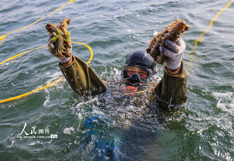 2021年4月20日,在山东省荣成市虎山镇天海湾海参养殖海区,“海猛子”在展示捕捞的海参。李信君摄(人民图片网)