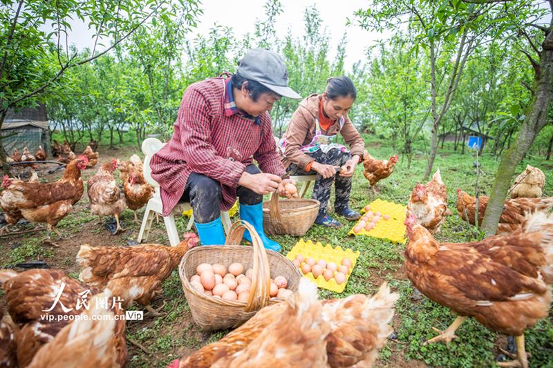 2021年4月17日,贵州省毕节市金海湖新区岔河镇塘丰社区400余亩林下生态养鸡场里一派繁忙,村民们忙着收集、清理、分装鸡蛋,供应市场需求。罗大富摄(人民图片网)