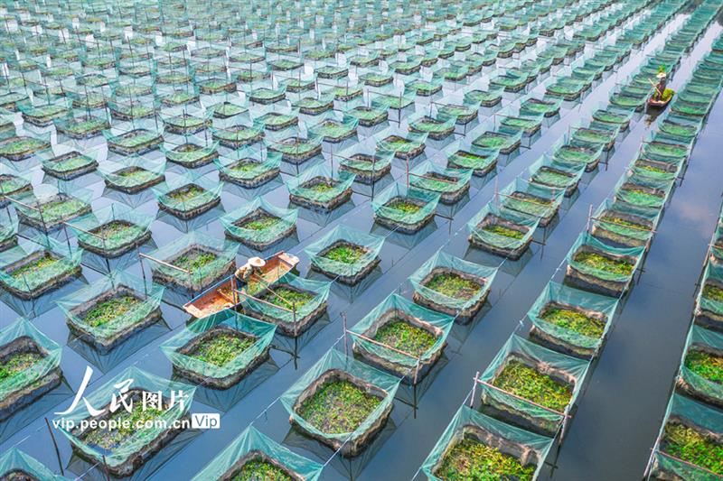 2021年4月21日,广东省广州市白云区江高镇硖石村鳝鱼养殖基地,清清碧水间一排排整齐有序的“绿色网箱”春意盎然,养殖户摇着小船给用来养殖黄鳝的网箱里种植生态水草。邱新生摄(人民图片网)