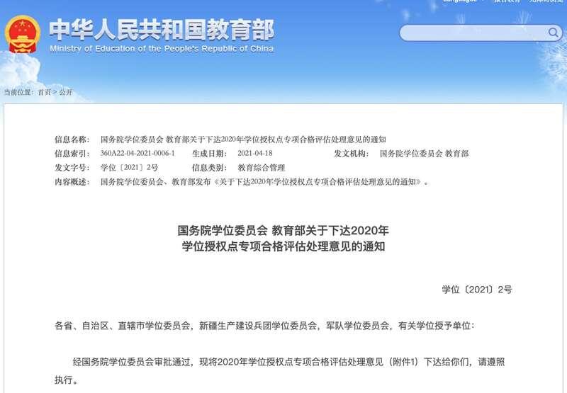 中国青年报客户端北京5月11日电(中青报·中青网记者 叶雨婷)今天记者从教育部获悉,国务院学位委员会、教育部发布《关于下达2020年学位授权点专项合格评估处理意见的通知》。通知指出,经国务院学位委员会审批通过,现将2020年学位授权点专项合格评估处理意见下达。
