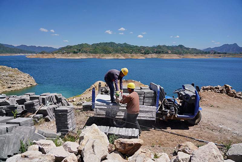 6月3日,工人在喜峰口西潘家口段长城保护维修工程施工现场搬运维修所需砖石。