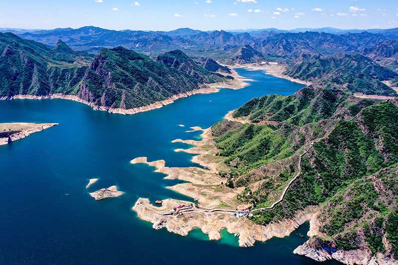 6月3日,船只停靠在喜峰口西潘家口段长城脚下运输维修所需砖石(无人机照片)。