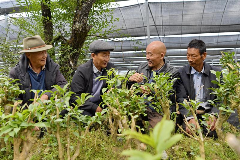 在西藏波密县易贡乡贡仲村金茶树苗圃里,西藏金茶树茶叶有限公司负责人张延礼(右二)向村民介绍茶树管理技术(5月23日摄)。新华社记者 张汝锋 摄