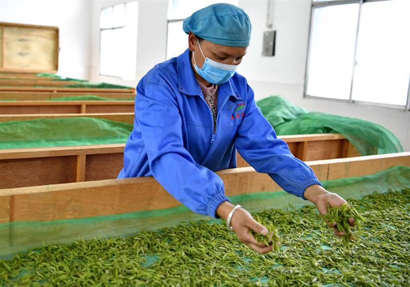 西藏易贡茶场加工车间的工人在进行茶叶摊青(5月22日摄)。新华社记者 张汝锋 摄