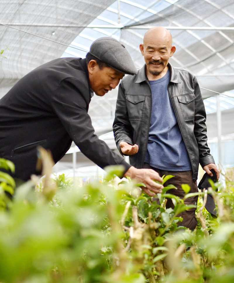 在西藏波密县易贡乡贡仲村金茶树苗圃,村党支部书记宗珠(左)和西藏金茶树茶叶有限公司负责人张延礼(右)进行茶树管理(5月23日摄)。新华社记者 张汝锋 摄
