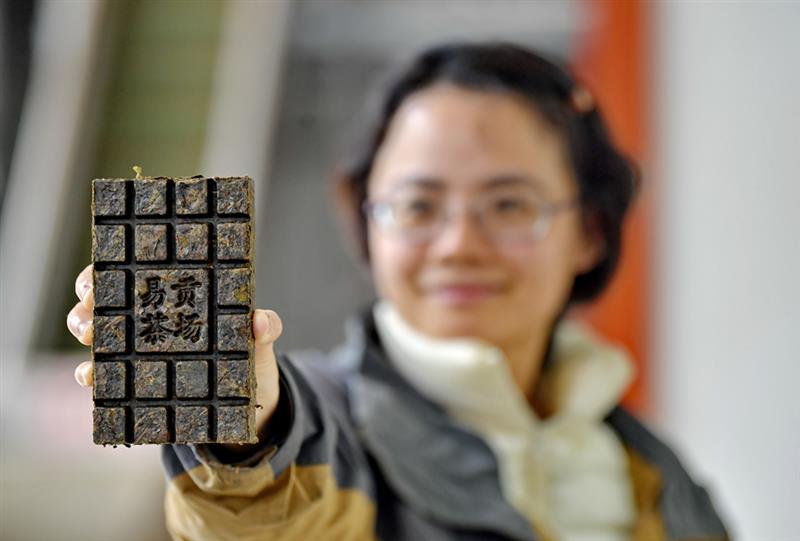 西藏易贡茶场的一名工作人员展示生产的特色茶砖(5月22日摄)。新华社记者 张汝锋 摄