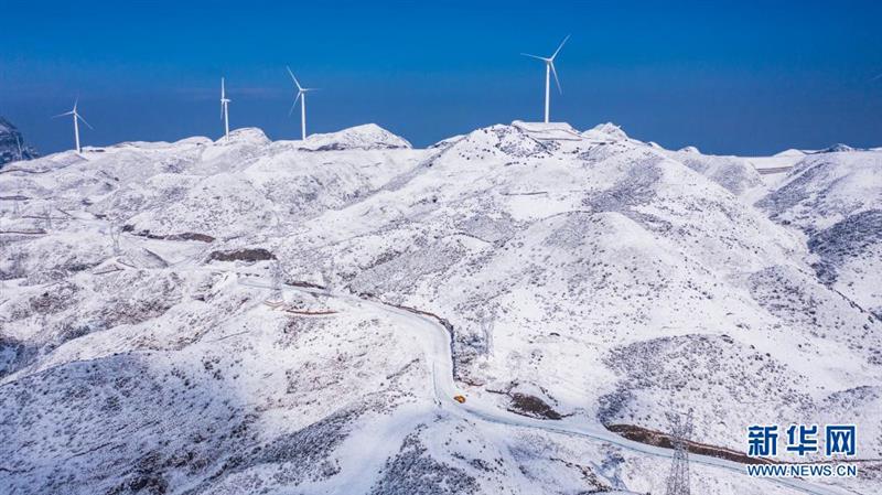 雪后的六盘水市盘州四格风电场(1月12日摄,无人机照片)。新华社记者 陶亮 摄