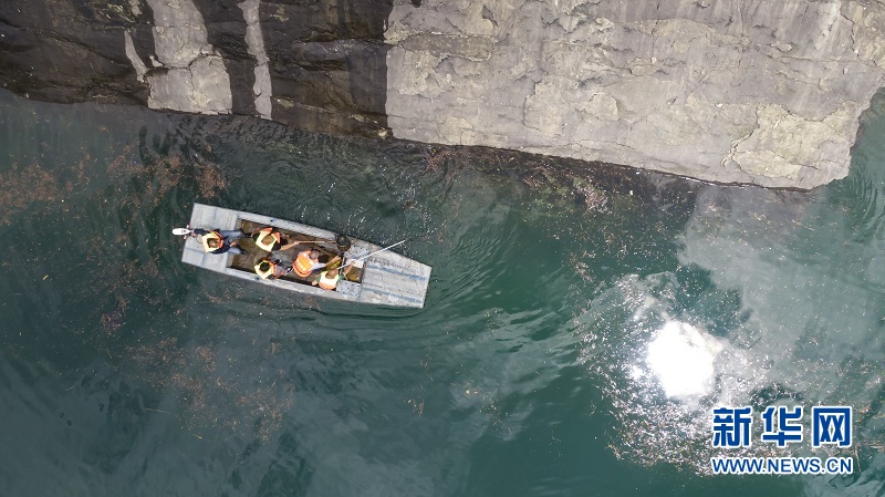 近日,持续降雨导致水面漂浮物增多,谭大凡和建始县水利局工作人员清理水面。