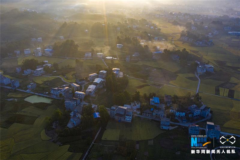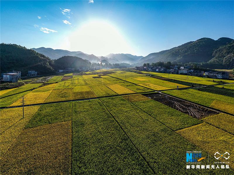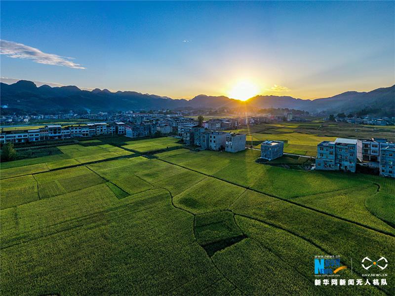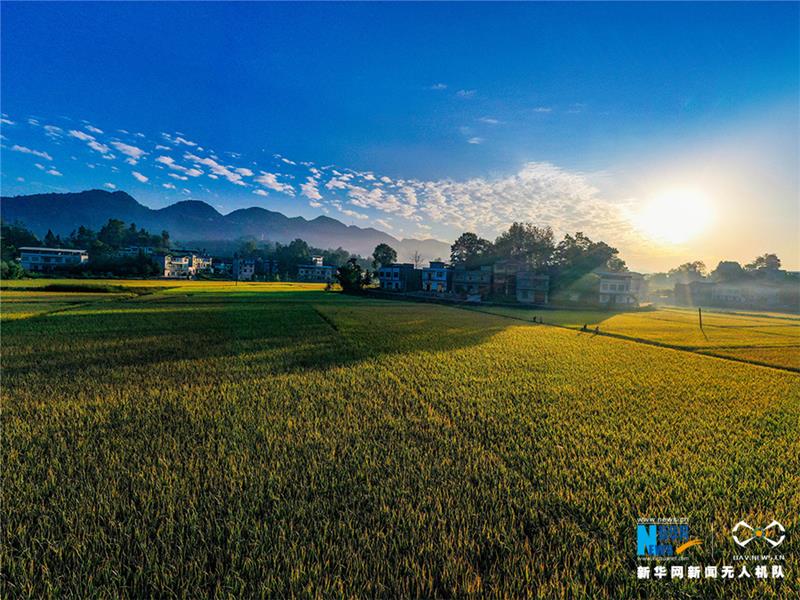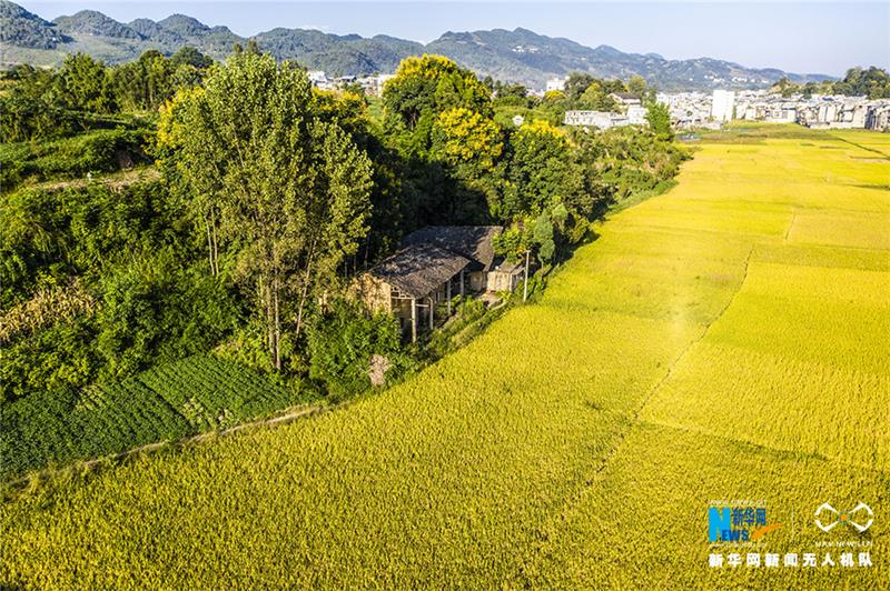 秋天是田野迎丰收的季节,也是田园最浪漫的时候。近段时间,在重庆市巫溪县羊桥坝,蓝天白云,金黄稻田,农民新居,一起上演了如诗如画的秋景。新华网发(王强 摄)