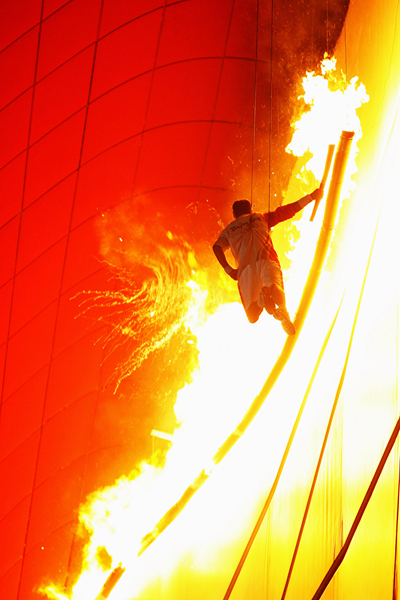 2008年8月8日,国家体育中心(鸟巢),北京奥运会开幕式上,体操运动员李宁高举奥运火炬。(资料图片)视觉中国供图