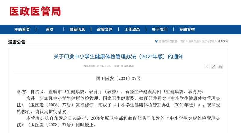 中国青年报客户端讯(中青报·中青网记者 刘昶荣)日前,国家卫健委联合教育部发布了《中小学生健康体检管理办法(2021年版)》(以下简称《办法》)。国家卫健委对《办法》的解读中指出,此次修订的《办法》细化了结果反馈与健康档案管理的具体要求,明确提出对出现健康问题的学生建立档案并随访。