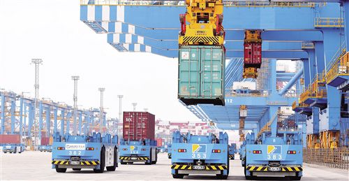 左图 11月7日,山东港口青岛港自动化码头,自动起重机在吊装外贸集装箱。