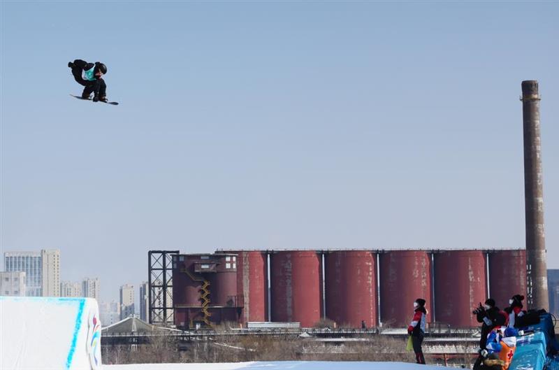 2月15日,苏翊鸣在单板滑雪男子大跳台比赛中。新华社记者兰红光摄