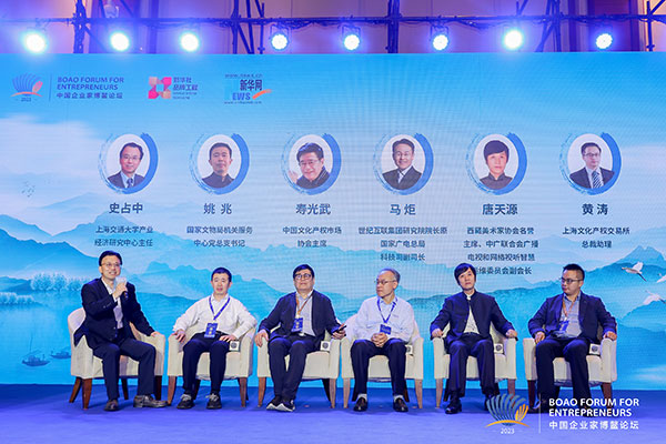 第三场圆桌对话主题为“数字经济时代文化产业发展的机遇与挑战”,由上海交通大学产业经济研究中心主任史占中主持。国家文物局机关服务中心党总支书记姚兆在对话中表示,由政府引导企业参与,科研机构将科研成果持续介入,一定是文博行业产业发展最佳契合的方向。中国文化产权市场协会主席寿光武认为,数字文化产业会在数据时代升级改造呈现繁荣和绚丽的色彩,同时文化产业又会融合加入新的产业,它会成为整个中华民族生态文明生态重要的一环,它的边界和成长会有更大的疆域。世纪互联集团研究院院长、原国家广电总局科技司副司长马炬从技术的角度分析了人工智能今年来产生爆炸性增长和极高关注度的原因,呼吁要高度重视从AI到AIGC生产出来的文化产品。西藏美术家协会名誉主席、中广联合会广播电视和网络视听智慧运维委员会副会长唐天源表示,广大艺术家应重新领略数字时代送给我们的饕餮盛宴,从精神上享受它,在数字时代打造出更多优秀的文化产品。上海文化产权交易所总裁助理黄涛认为,海量的文化资源和数字内容的沉淀积累,提供着巨大的机会,期待更多的从业者和创业者加入进来,大家共同努力,繁荣好整个生态的发展。