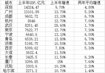 15个副省级城市上半年GDP:深圳总量第一 厦门增速最快