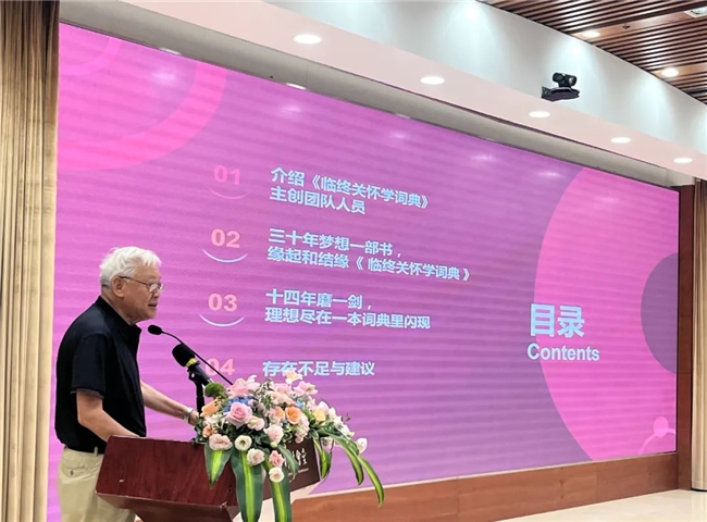 联合副主编李义庭教授在发言中说,词典的编写历经14个寒暑,许多词条从生到熟,反复推敲,通过采用术语学新方法,制定临终关怀学词典相关原则和词条规范释义流程,引入考证法提高词条的规范性和科学性,最后按词典工具书方法进行应用编排。