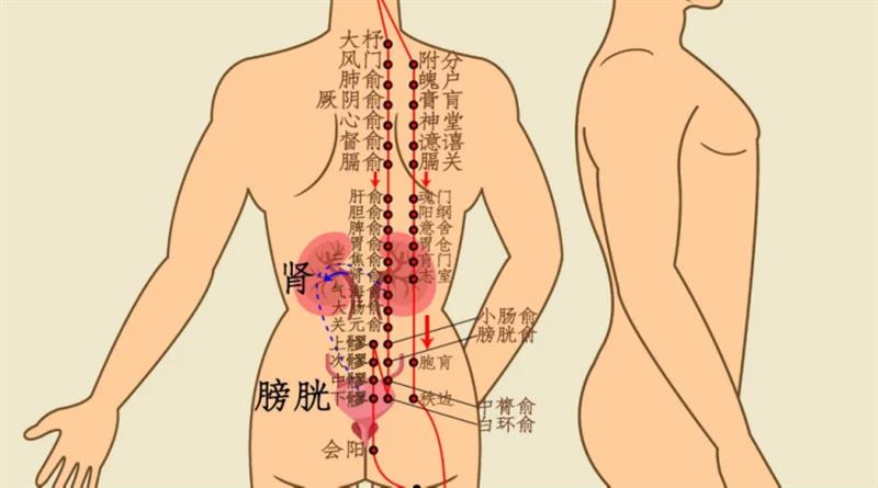 背部是人体的督脉和膀胱经的循行部位。督脉统领全身之阳经,膀胱经则是一条从头到脚、贯穿全身的经脉。