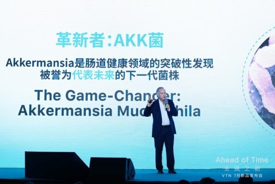 Ross Walker博士充满激情的为来宾介绍了AKK菌的诸多优势:2004年,AKK之父Willem Meindert de Vos及团队首次发现一种能够分解肠道粘液的细菌–AKK菌,对于人体健康而言,AKK菌具有多方面的积极影响。研究发现,AKK菌是一种革兰阴性肠道原籍厌氧球菌,它可以利用黏蛋白作为其唯一的碳、氮和能量的来源,就像是肠道里的“小精灵”,能够调节肠道菌群平衡。一方面它可以阻断多余脂肪和碳水的吸收,减少身体对这些高热量物质的摄取;另一方面,它能产生短链脂肪酸,可以让脂肪细胞不再吸收脂肪。而且,AKK菌还能抑制过剩食欲,避免我们暴饮暴食,从而达到减少热量摄入的目的。也因此,AKK菌成为了时尚健康人群形体管理的宠儿。
