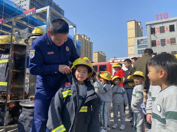 孩子们认真列队聆听消防员讲解消防车的用途、消防员的接警处置程序,以及如何在日常生活中做好防火防灾,还一一穿戴起消防服和防护面具,小手都拽得紧紧的,仿佛自己正亲历着“火灾救援”任务。半天的体验活动,使幼儿加深了对消防员的职业了解,产生职业敬畏感。家长们纷纷对此表示肯定,感谢幼儿园与家委会给予孩子在真实情境中认知社会、品尝艰辛、理解工作的机会,帮助孩子懂得分享、学会合作、尊重劳动。