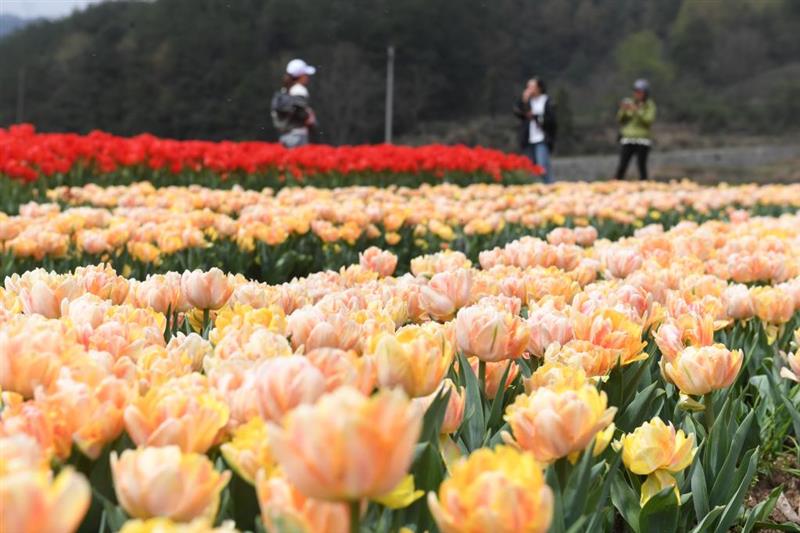 新华社杭州3月29日电(记者商意盈)28日,记者沿着210省道来到浙江省金华市浦江县杭坪镇乌浆村,这个位于浙中盆地的小山村掩映在百亩郁金香中。游客和摄影爱好者驻足流连,几名主播正在郁金香花丛中直播卖花,一片春日里的热闹景象。