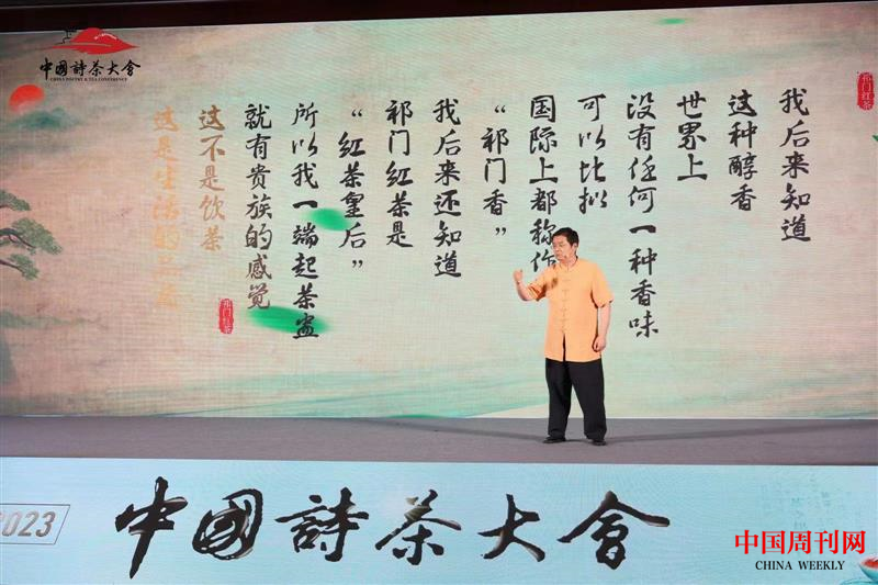 “这扇门,父亲生前就指给我看过/之前我并不知道有这扇大门,以及打开大门之后的/那种红霞满天的境界......”著名朗诵表演艺术家徐涛用他那富有磁性的声音朗诵了一首现代诗——《祁门红茶》,抑扬顿挫、娓娓道来的诗句仿佛流淌出了“像花蜜,像水果,像早春或者晚秋的浓香”,一下直击到大家的心灵。这首诗是原中国作家协会副主席、著名作家、诗人、编剧黄亚洲为祁门特意创作的,赋予了“祁红”更加丰富的茶文化内涵。
