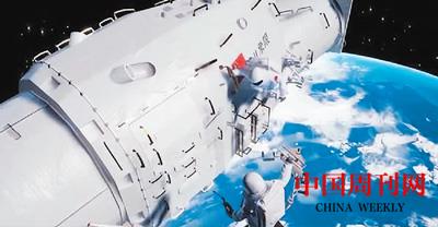 航天员从天宫空间站出舱开展巡天空间望远镜维护作业示意图