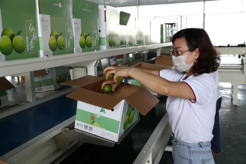 7月23日,重庆乌牛村,工作人员在分选车间挑选仙桃李装箱。(中国日报记者 王壮飞 摄)