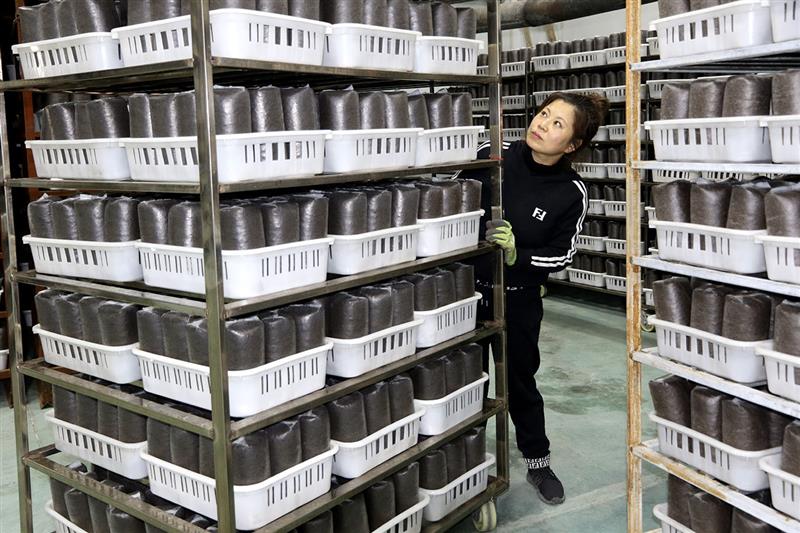 在黑龙江省宝清县宝清镇双泉村的食用菌基地,食用菌种植专业合作社理事长鞠秀芹查看菌包(4月16日摄)。新华社发