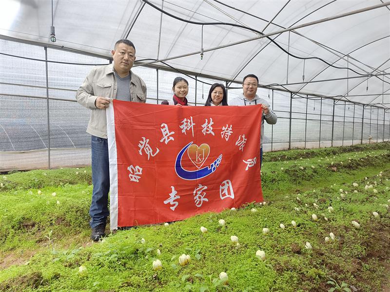 2020年6月3日,西南医科大学副教授夏纪毅(右一)与同事在四川凉山彝族自治州昭觉县火普村考察灵芝种植产业时合影。新华社发