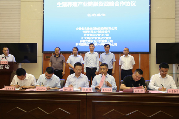 会上,安徽省农业信贷融资担保有限公司、合肥科技农村商业银行与牧原食品安徽分公司、正大集团农牧食品安徽区、新希望集团安徽新六养殖有限公司、安徽安泰农业开发有限公司签署战略合作协议,为生猪养殖供应链企业及其上下游各类农业经营主体提供金融服务,全力支持安徽省生猪产业发展。