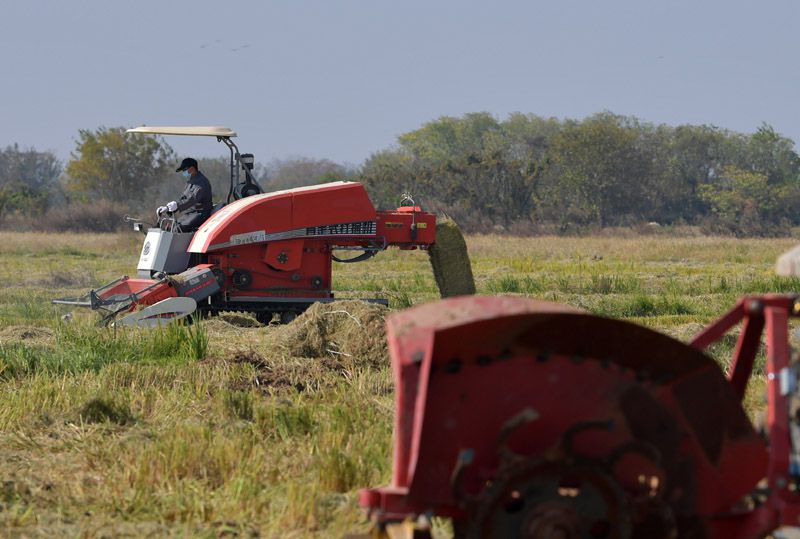 11月14日,在江西省南昌县蒋巷镇大田农社智慧农场,秸秆打捆作业设备在进行现场演示。