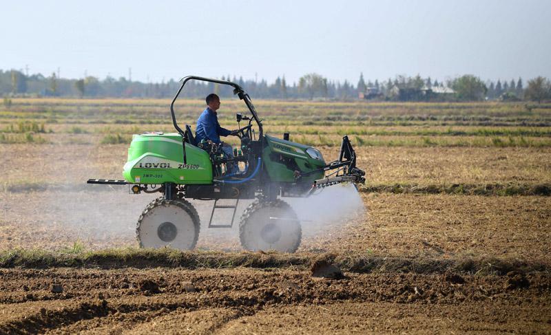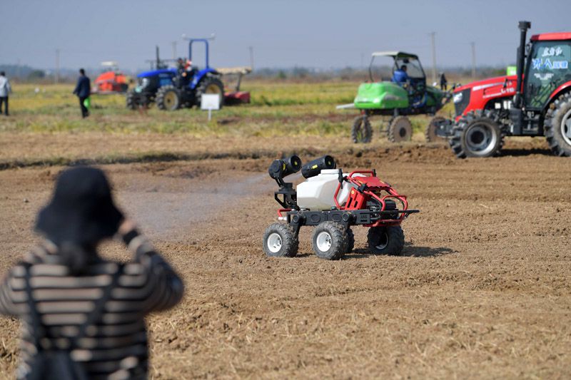 11月14日,在江西省南昌县蒋巷镇大田农社智慧农场,无人植保车在进行现场演示。