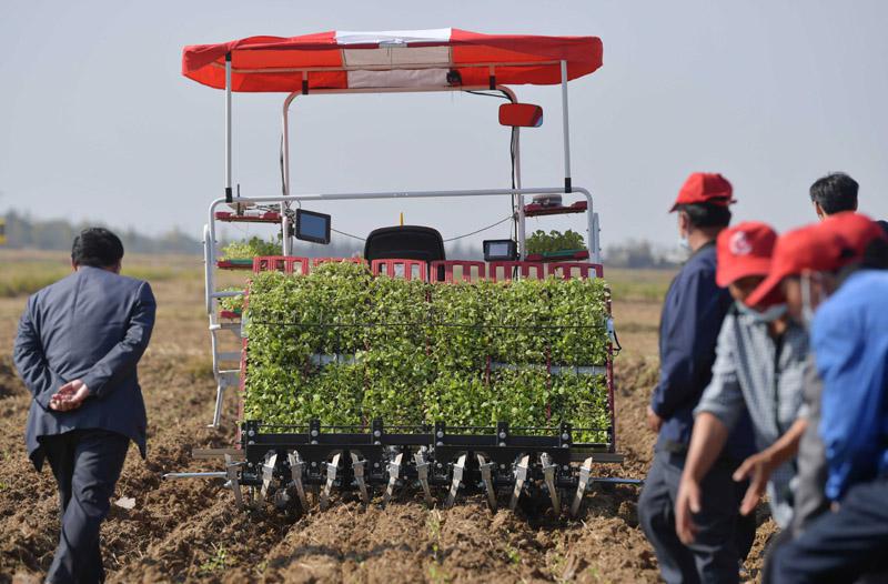 11月14日,在江西省南昌县蒋巷镇大田农社智慧农场,油菜精准移栽设备在进行现场演示。