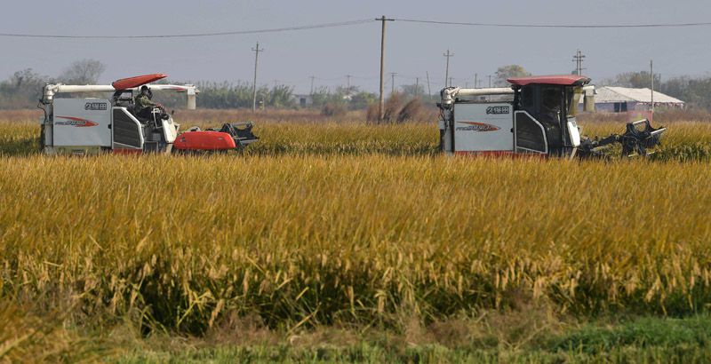 11月14日,在江西省南昌县蒋巷镇大田农社智慧农场,无人收割机在现场演示水稻收割。