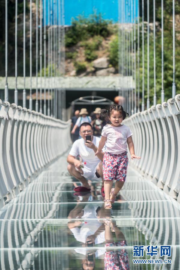 游客在浙江省余姚市大岚镇丹山赤水景区的玻璃栈桥游玩(2020年8月25日摄)。新华社记者 江汉 摄