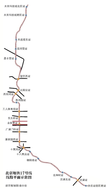 记者了解到,作为北京市快线网首轮实施线路,17号线的建设将有效分担地铁5号线南北端、地铁10号线东段的客运压力,同时间接缓解东直门、宋家庄枢纽的换乘压力。