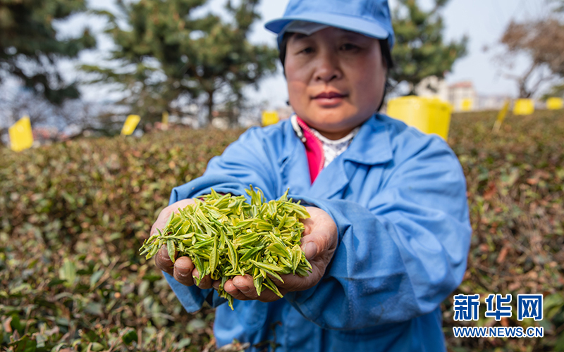 4月11日,采茶工展示新采摘的春茶。新华网发(刘明元 摄)