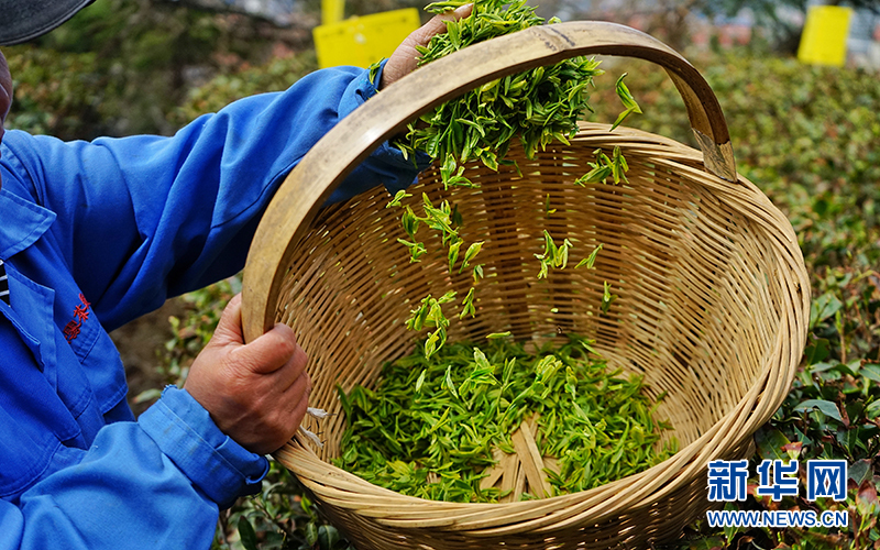 4月11日,采茶工在用心采摘春茶。新华网发(刘明元 摄)