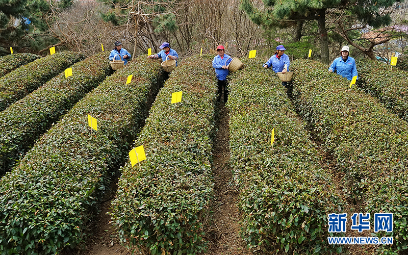 4月11日,采茶工在青岛崂山云雾茶场采摘春茶。新华网发(刘明元 摄)