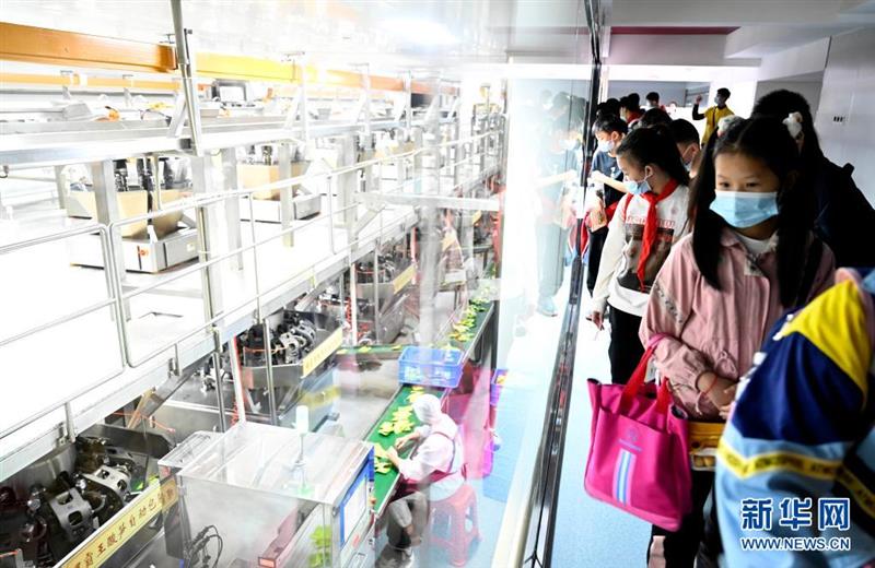 4月29日,在广西柳州螺蛳粉产业园,参加研学团的师生在一家螺蛳粉企业参观。