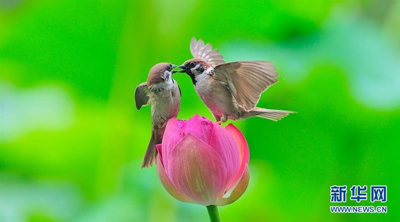 两只鸟儿在荷花花蕾上嬉戏。新华网发(李志强摄)