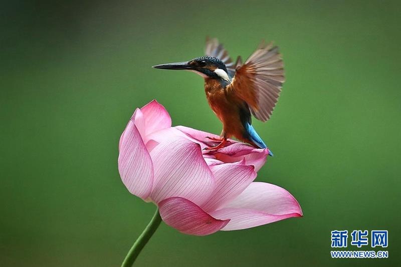 一只翠鸟飞停在荷花上。新华网发(李志强摄)