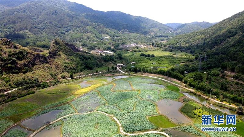 吕田镇草埔村利用水源充足、连片土地广阔等优势,大规模种植荷花,发展荷花产业,促进乡村旅游。图为航拍吕田镇草埔村。新华网发(胡东和摄)