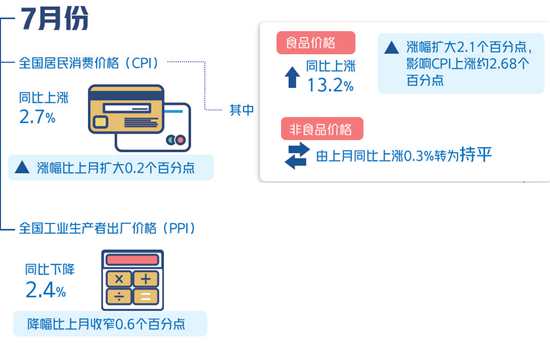 8月10日,国家统计局发布全国居民消费价格指数(CPI)和工业生产者出厂价格指数(PPI)数据。7月份,CPI同比上涨2.7%,同比涨幅连续两个月扩大,仍处于“2区间”;PPI同比下降2.4%,降幅比上月收窄0.6个百分点。